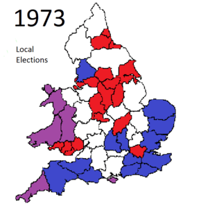 - 12 April 1973: Metropolitan county councils (601 councillors), Non-metropolitan county councils (3,128 councillors), Welsh county councils (578 councillors) and the Greater London Council (107 councillors & aldermen).