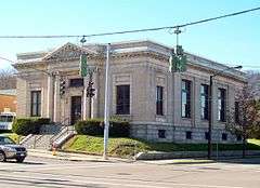 US Post Office-Corning is a historic post office building located at Corning in Steuben County, New York. It was built in 1908-1909 and is one of a number of post offices in New York State designed by the Office of the Supervising Architect of the Treasury Department, James Knox Taylor. It is a rectangular, one story building faced with pressed yellow brick in the Classical Revival style. The exterior features elaborate terra cotta decoration.[2]