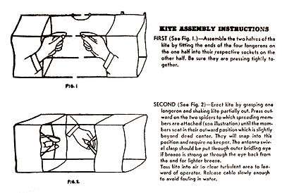 The United States Navy experimented with kites for emergency radio use as early as 1922 when Commander Taylor and Lieutenant C. D. Palmer of the Anacostia Air Station Radio Laboratory designed kites to lift antenna for radios in downed seaplanes. The aircraft of the day had trailing antenna that only functioned while in flight. Two kites were issued, one for stronger and the other for lighter winds, as well as a reel of light antenna wire and a small generator that could be placed in the air stream of a functioning engine to power the radio.[12]
