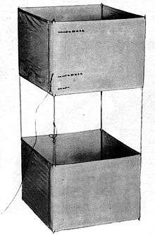 The first kite used by the United States Army Signal Corps specifically for raising an antenna was designed and built by Sergeant Thomas I. King, Signal Corps Company A, while stationed at Fort Leavenworth, Kansas, in 1905. The “King” kite was large, 7 feet high and 5 feet wide, made of 50 yards of white Japanese silk on a bamboo frame, and weighed less than 2 pounds.[2] Similar to Silas J. Conyne's kite of 1902,[3] it had a diamond shape with a squared-off top and bottom, keel, and large opening in the center to gave it some of the stability of a box kite. It was used either singly or in trains of 2 to 4 kites or, on less windy days, in conjunction with a balloon to provide extra lift.