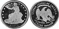 The bill provided, in part, for the striking of trade dollars which held legal tender status up to five dollars.[9] The legal tender provision was added by a last-minute rider at the behest of silver interests.[10] At the insistence of Ohio Senator John Sherman, the weight and fineness of the piece was indicated on the reverse, an attribution which numismatic historian Don Taxay found incomprehensible as "Chinese merchants would never understand them".[11]