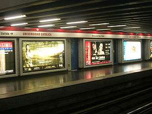 Universidad Católica is an underground metro station on the Line 1 of the Santiago Metro, in Santiago, Chile. It provides access to the Centro Cultural Gabriela Mistral and is named after the Pontifical Catholic University of Chile, whose main administrative offices are housed in a building close to the station.