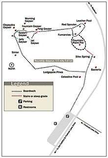 Hot Springs Basin is located 15 miles (24 km) north-northeast of Fishing Bridge and has one of Yellowstone's largest collections of hot springs and fumaroles.[19] The geothermal features there release large amounts of sulfur. This makes water from the springs so acidic that it has dissolved holes in the pants of people who sit on wet ground and causes mounds of sulfur three feet (1 m) high to develop around fumaroles. The very hot acidic water and steam have also created voids in the ground that are only covered by a thin crust.