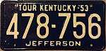 | 1953 | Embossed white numbers on dark blue plate; "KENTUCKY" embossed in narrow white block letters at top with "-'53" to right; county name embossed in wide white block letters centered at bottom | "TOUR" embossed in narrow white block letters to left of state name, giving "TOUR KENTUCKY" | 123-456 | Issued in blocks by county | ||