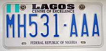 Nigerian vehicle registration plates in current used were introduced in 1992 and revised in 2011. In size and shape, they are based on those of the United States. Nigeria and Liberia are the only two African countries that do not use the European license plate format.