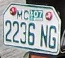 Green characters (1981 series) or black characters (2014 series) on a white background with the letters "MC" stamped on the upper left-hand corner next to the registration sticker. Usually in the format LL-DDDD (e.g. NK 9081) or LL-DDDDD (e.g. NA 25953), but with the rise in the number of motorcycles on the road, the DDDD-LL (e.g. 9081 NK) format has also come into use.
