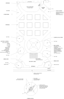 Immediately behind the pergola is another sculptural element: a 12-foot-diameter (3.7 m) compass design made of crushed stone, inter-planted with several varieties of thyme.
