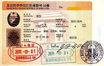 Visitors to North Korea must obtain a visa from one of the North Korean diplomatic missions unless they come from one of the visa exempt countries.[1]