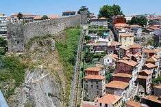Construction of a series of walls began in 1336 in the reign of King D. Afonso IV on the foundations of a small "circus" that encircled the area of smaller dimensions, reflecting the great development of the burg.[1] The basis of these new walls were marked by an inscription dating 1348 over the gate of Postigo do Carvão. This Romanesque wall, was constructed in the 12th century, corresponding to the administrative and urbanistic consolidation of Porto,[2] after a long period of dispersed population.[1] Of this structure, there are important remains that were not destroyed in the intervening years. Encircling the Sé's wall (the centre of the medieval town) is an irregular oval, cut by four principal gates, among them the Gate of Vandoma (that was demolished by the municipal council in 1885).[1] The difference between the Romanesque walls and the ones constructed in the 14th century developed in the course of 200 years, as the population grew to about 10000 inhabitants. The city developed in all directions, but primarily towards the west and north, linked by the elevated bridges of Vitória and Batalha; its growth is easily recognizable in the urban relief.[1] The main line is located in the east, easily visible from the bridge Ponte D. Luís, and comprises a section of walls with road, protected by two rectangular towers.[1]