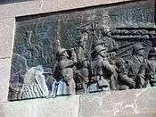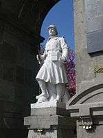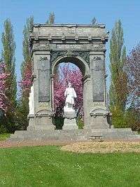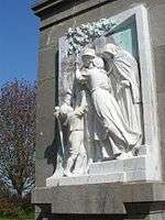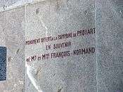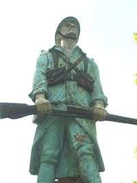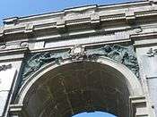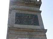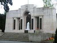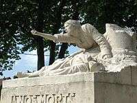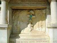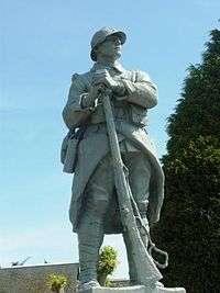 The monument was erected in 1924 and the land involved was the gift of Mr.and Mrs Normand who also put up most of the funds involved in erecting the monument. Mr. Normand was a wine merchant in the Champagne area. The Normands had lost their only son, killed in combat in the Great War and the monument stands in the grounds of the local chateau owned by the Normand family. Another contributor to the cost of this monument was the town of Cognac who had "adopted" Proyart during the war. The monument was inaugurated on 28 September 1924 by General de Castelnau who had commanded the French army in the Somme from September 1914 to August 1915. On the sides of the arch are three bas-reliefs: "Le Départ", "L’assaut à Proyart", and "La France reconnaissante à Proyart." The relief "L’assaut à Proyart" shows eight soldiers advancing towards the enemy lines including one with field glasses, another on look-out and a third with a periscope. In the distance another group of soldiers are in the same trench. The relief shows trees which had been destroyed and the barbed wire of no man's land. The relief "Le Départ" portrays a soldier saying goodbye to his family; his wife, his child, his mother, all in front of the family home. In the rear there is a village and its church. The relief "La France reconnaissante" is an allegory of a victorious France wearing a phrygien bonnet and a crown of laurel and embracing a soldier holding the national flag. A battalion of soldiers is shown marching by and there is the Arc de Triomphe in Paris encircled by torches of fire.[32] The central figure of the soldier is carved from marble and the rifle is made from cast iron. The soldier's foot rests on a German helmet (the point at the top of the helmet is no longer there).