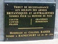 plaque on the Framerville-Rainecourt war memorial acknowledging British and Australian soldiers who died in the area