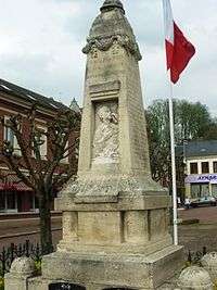 Roye Somme The memorial stands in the Place des Combattants in the centre of the town. Carved in stone from Romaneche in Ain this is a work by Jules Déchin and the entrepreneur Petit, and was based on a project by the Grand Prix de Rome winning architect Rubin. This composition juxtaposes allegories of war and peace. On one side of the monument is an allegory of the town of Roye, crowned and holding a palm on which is hooked the Croix de guerre with the helmet of a soldier placed on a broken cross at its feet and on the other is a representation of the bombardment of Roye and the sufferings of the war- a woman and her child sit and the child is clearly disturbed and in the background is the ruins of the town with what is left of the church of Saint-Pierre. The monument cost 80,000 francs and was inaugurated on 21 July 1927 by Édouard Herriot.[34]