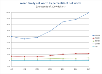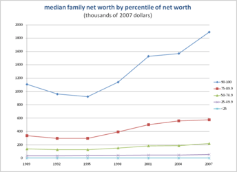 The percentage of net worths ranging from $500,000 to one million doubled while the percentage of millionaires tripled.[1] From 1995 to 2004, there was tremendous growth among household wealth, as it nearly doubled from $21.9 trillion to $43.6 trillion, but the wealthiest quartile of the economic distribution made up 89% of this growth.[3] During this time frame, wealth became increasingly unequal, and the wealthiest 25% became even wealthier.