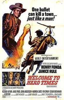 Welcome to Hard Times is a 1967 Western film based upon a novel by E. L. Doctorow.[1] The movie was directed by Burt Kennedy.[2] It stars Henry Fonda as the leader of a dying town who is too weak to stand up to a brute terrorizing the few remaining residents.
