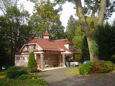 "Westlawn", also known as Charles Essig House, is a historic home located at Wallingford, Delaware County, Pennsylvania. It was built in 1882, and is a 2 1/2-story, asymmetrical dwelling with a cross gable roof and faceted pentagon addition, in the Queen Anne style. It has a variety of exterior treatments including brick, clapboard, novelty shingles, half-timber beams, and stucco. It features gable dormers, a turret, a square tower, wraparound porch, and three corbelled chimneys. The house was built for Charles Essig, organizer and first dean of the School of Dentistry, University of Pennsylvania.[2]