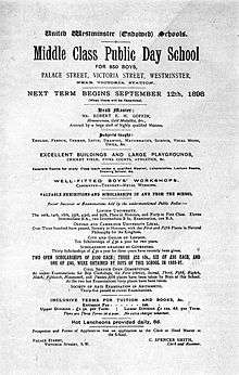 The charters and foundations of several historic charity schools[3] were by Act of Parliament in 1873 incorporated into the Grey Coat Hospital Foundation and United Westminster Schools (UWS) Foundation. UWS comprised the Westminster City School and Emanuel School, Wandsworth; The Grey Coat Hospital Foundation comprised the Grey Coat Hospital, Westminster and Queen Anne's School, Caversham. In 1910 The Worshipful Company of Clothworkers transferred the Sutton Valence School in Kent into UWS.[4][5]