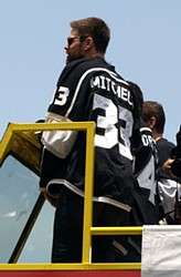 Mitchell began the season on a defensive pairing with Drew Doughty.[59] Nearly a month into the campaign, he notched his first goal as a King, scoring short handed against the Dallas Stars in a 5–2 victory on October 28, 2010.[60] In November 2010, he sustained a wrist injury during a game against the Nashville Predators,[59] sidelining him for 12 games.[55] After recovering, he suffered a knee injury, keeping him from another 11 games.[55] Later in the season, during a game against the Phoenix Coyotes, on March 3, 2011, Mitchell was hit in the face by a shot from opposing forward Kyle Turris, requiring 53 stitches.[55] He did not miss any additional games, however. Mitchell finished the season with five goals and five assists over 57 games, ranking third in average ice time per contest with the Kings. He added a goal and an assist in six playoff games as the Kings were eliminated by the San Jose Sharks in the first round. On February 24, 2012, Mitchell signed a two-year contract extension with the Kings. In the 2012 playoffs, Mitchell helped the Kings defeat the Vancouver Canucks in the first round, the St. Louis Blues in the semi-finals (winning four games straight) and the Phoenix Coyotes in the Conference Finals. The Kings made the Stanley Cup Finals for the first time since 1993 and defeated the New Jersey Devils; this also marked Mitchell's first appearance in the Stanley Cup Final. Mitchell was the second player, after team captain Dustin Brown, to hoist the Cup after the win.