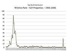 The first recorded residence in Wilshire Park was built in 1908. The transitional Prairie School style home (right) is an example of the work of noted architect Lloyd Wright. The neighborhood also features a 1938 apartment complex by the only female architect in Los Angeles at the time, by Edith Mortensen Northman.[15] Most of Wilshire Park was fully built out by 1926. The graph shows the pattern of development.