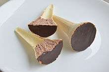 Winter ice cream (Hungarian: téli fagylalt [ˈteːli ˈfɒɟlɒlt] or téli fagyi [ˈteːli ˈfɒɟi]) is a Hungarian confectionary similar in appearance to ice cream in a cone, but traditionally having ganache or a similar kind of sweet cream filling with usually a chocolate-cocoa flavoring.[1][2] It gained popularity in the 1970s in communist Hungary,[3] being produced as a winter alternative to "summer" ice creams, which were deemed to be too cold for winter sweets.[2] Apart from grocery shops, it was frequently sold as part of the national railway's catering service (utasellátó).[3] The confectionary's popularity faded in the early 1990s, when, after the end of communism, foreign candy manufacturers and their products appeared on the Hungarian market.[3] However, along with some other snack foods and soft drinks of communist-era Hungary, winter ice cream garnered renewed interest in the late 2000s and 2010s.[4][3][5]