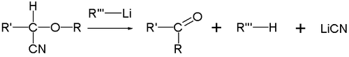 The intermediate product is an alkoxy lithium salt and the final product an alcohol. When R" is a good leaving group and electron withdrawing functional group such as a cyanide (CN) group,[3] this group is eliminated and the corresponding ketone is formed.