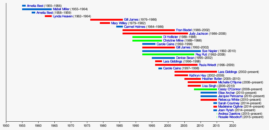 The first successful female candidates for the House of Assembly were Amelia Best and Mabel Miller, both Liberals, who were elected in 1955. In 1962, Miller (Best had lost election twice, in 1956 and 1959) was joined by the first Labor woman, Lynda Heaven. In 1964, both Miller and Heaven left the House, and women were not represented again until 1976, when Labor's Gill James was elected. Since then women have been continuously represented in the House.