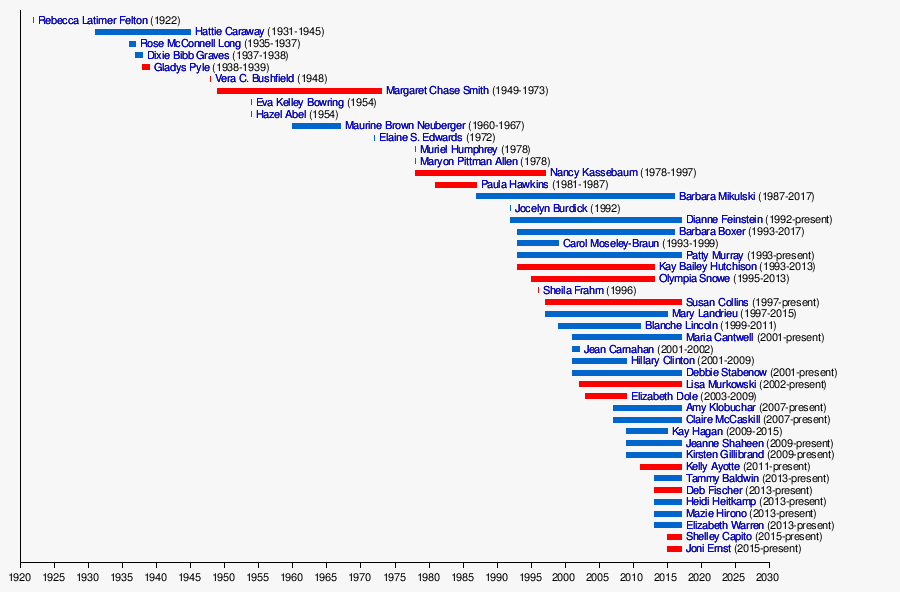 Since then, many more women in both the Democratic and Republican parties have campaigned for the Senate, and several have been elected. Twenty are currently serving in the 114th Congress (2015–16).