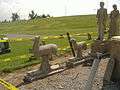 The total area of the monuments are 17 by 33 feet (5.2 by 10.1 m). All eighteen monuments face east, like most of the gravestones in Maplewood Cemetery. The most prominent is a life-size likeness of Wooldridge himself, a 6-foot-tall (1.8 m) marble statue in the center of the site, made in Italy.[4] Fourteen other monuments surrounding Wooldridge are made of limestone, and have more rigid poses. The largest of these represent Wooldridge on his horse, named "Fop". The other limestone statues are 5 feet (1.5 m) tall on 3-foot-tall (0.91 m) bases, and represent family members. Behind these are replicas of a fox, a deer, and two hounds chasing them; the dogs are unidentified on the statue but represent Wooldridge's dogs "Towhead" and "Bob".[3] The statue makers, who hailed from Mayfield and Paducah, Kentucky, never before or after had a more "complex" or "ambitious" project.[8]