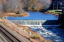 Constructed in 1890, it has withstood the floods that have taken out most of the other dams on the Quaboag River. In 2005, the Wrights Company conducted a feasibility study to return this dam to use for waterpower generation.[1] Originally, this dam provided waterpower to the large Wrights Mill complex. In the early 1900s, this complex was a knitting mill that produced cloth and various industrial knitted materials. Locally produced waterpower ran the looms and ancillary machinery. Currently, the available waterpower from the dam is only for fire suppression. However, it is unlikely that the dam will be returned to service for electricity generation soon.[1]