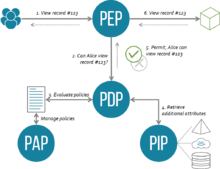 - An access control architecture with the notion of a Policy Decision Point (PDP) as previously discussed and a Policy Enforcement Point (PEP).
