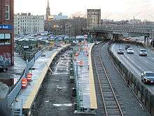 The rebuilt station was intended to be the first component of a larger, mostly private development called Fenway Center. The new station, which cost about $13.5 million, is planned to be powered entirely by solar panels after the development opens.[15] Although the developer, Meredith Corporation, wished to close the station during rebuilding, the MBTA elected to keep it open.[18][19] Fenway Center, which was to be built on the air rights over the adjacent Massachusetts Turnpike (I-90), would eventually cover much of the station.[16] As part of the development, walkways would be built above the station, allowing passengers to walk directly to the pedestrian bridge and platforms from Beacon Street and Brookline Avenue rather than passing through private parking lots. After lengthy negotiations, an air-rights deal between the city and the developer regarding Fenway Center was reached in May 2013.[20] As of June 2016, construction on the new buildings had still yet to begin, while financing and staging negotiations for the section not located over the station and highway were underway.[21]
