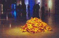 Yeşim Ağaoğlu has concentrated on art making with performance, visual material and objects.[5] At the beginning her poems, written on yellow paper with a conventional typewriter, occupied the center of these works. The yellow pages are a basic material and modest element of communication with the people, but when they are arranged in huge geometrical heaps in the exhibition spaces they also become a Fluxus installation. Her presence in the exhibition space is considered as performance, even if she does not make a performance in the sense that she is directly involved in the process of the artwork, but her continuous blending into the viewers' attendance gives the impression of a performance. Her approach to art-making is minimalist and modest. Avoiding popularity and sophistication she describes her works as "technically simple but conceptually rich."