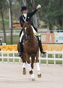 Yvonne Losos de Muñiz (born September 8, 1967 in Ibadan, Nigeria) is an international Grand Prix dressage rider that represents the Dominican Republic.[2] She won the individual bronze medal at the 2007 Pan American Games in Rio de Janeiro, Brazil, riding her approved Hannoverian stallion Bernstein. With that medal she repeated her performance from the 2003 Pan American Games held in her home country, where she also obtained the individual bronze medal riding a different mount, a Dutch mare named Inatana.[3]