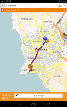 - Offline map rendering, navigation with voice guidance. Advanced options for navigation in the car, on foot or on bicycle.